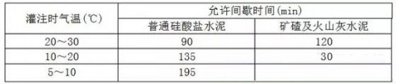⑺混凝土澆筑必須連續(xù),因施工需要留設(shè)施工縫,必須征得設(shè)計(jì)同意,并得到監(jiān)理認(rèn)可。允許間歇時(shí)間具體見下表;搗固選用的振搗器,其頻率、振幅、振動(dòng)速度等參數(shù)視混凝土的塌落度及骨料顆徑而定。